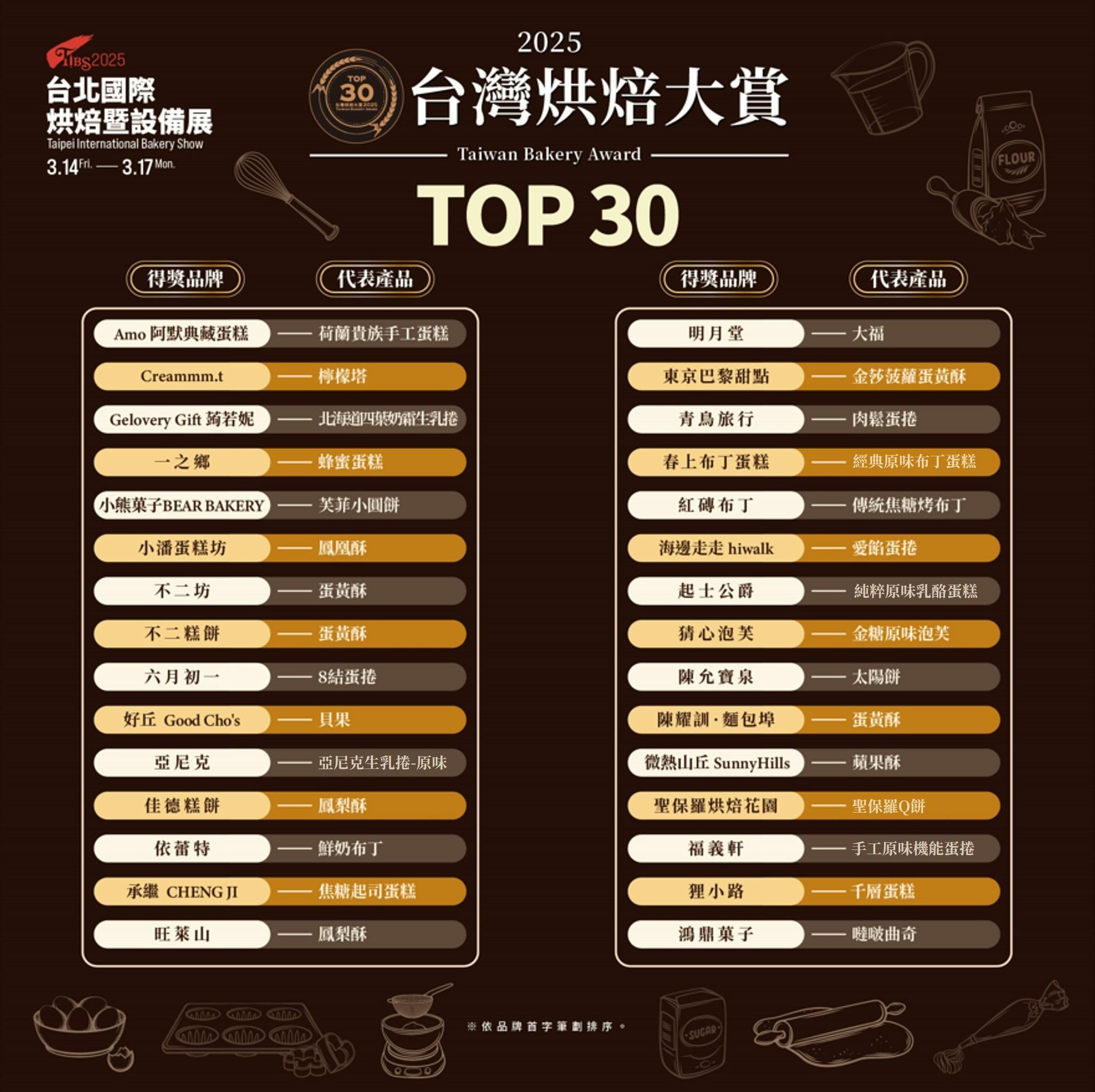 凡入圍TOP30榜單的店家,將受邀參與亞洲指標烘焙展會-2025台北國際烘焙暨設備展的「台灣烘焙大賞TOP30/潛力獎 主題專區」展出,將年度爆紅的品項帶給廣大逛展民眾;同時也有機會獲得媒體曝光、網路宣傳、社群推廣等行銷資源,大幅提升品牌知名度,成為下一個烘焙話題品牌!